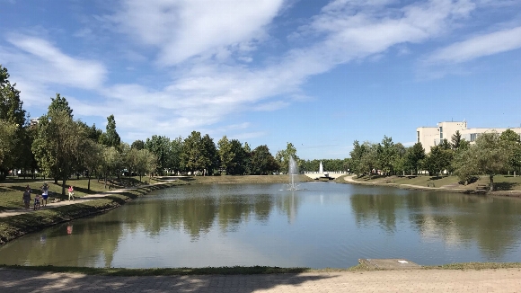 Tiszaújváros központjában sétány a Dísztó körül.
